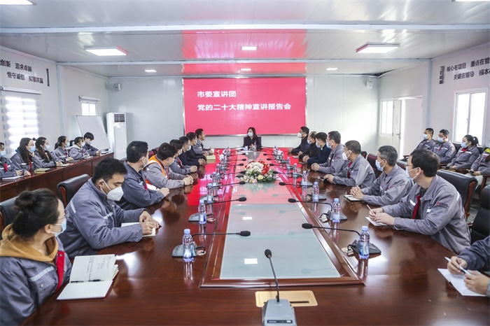 2023年11月19日上午,市委宣講團成員、市市場監管局黨組書記、局長景莉莉蒞臨華兆東南綠建宣講黨的二十大精神。市市場監管局黨組成員、副局長李永剛,運城建工黨委書記、華兆東南綠建總經理鐘永來等參加宣講。